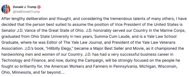 “After lengthy deliberation and thought, and considering the tremendous talents of many others, I have decided that the person best suited to assume the position of Vice President of the United States is Senator J.D. Vance of the Great State of Ohio.”